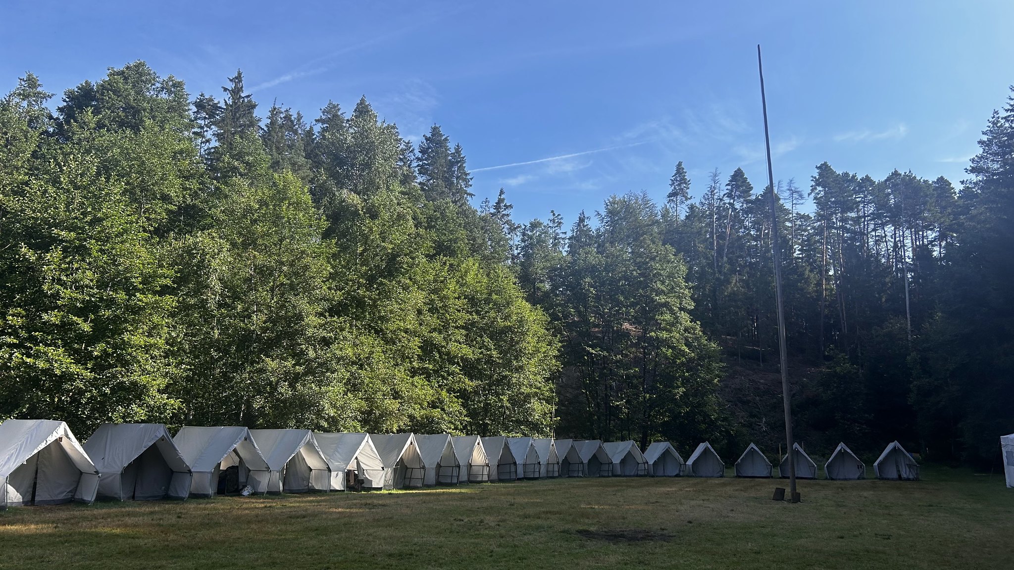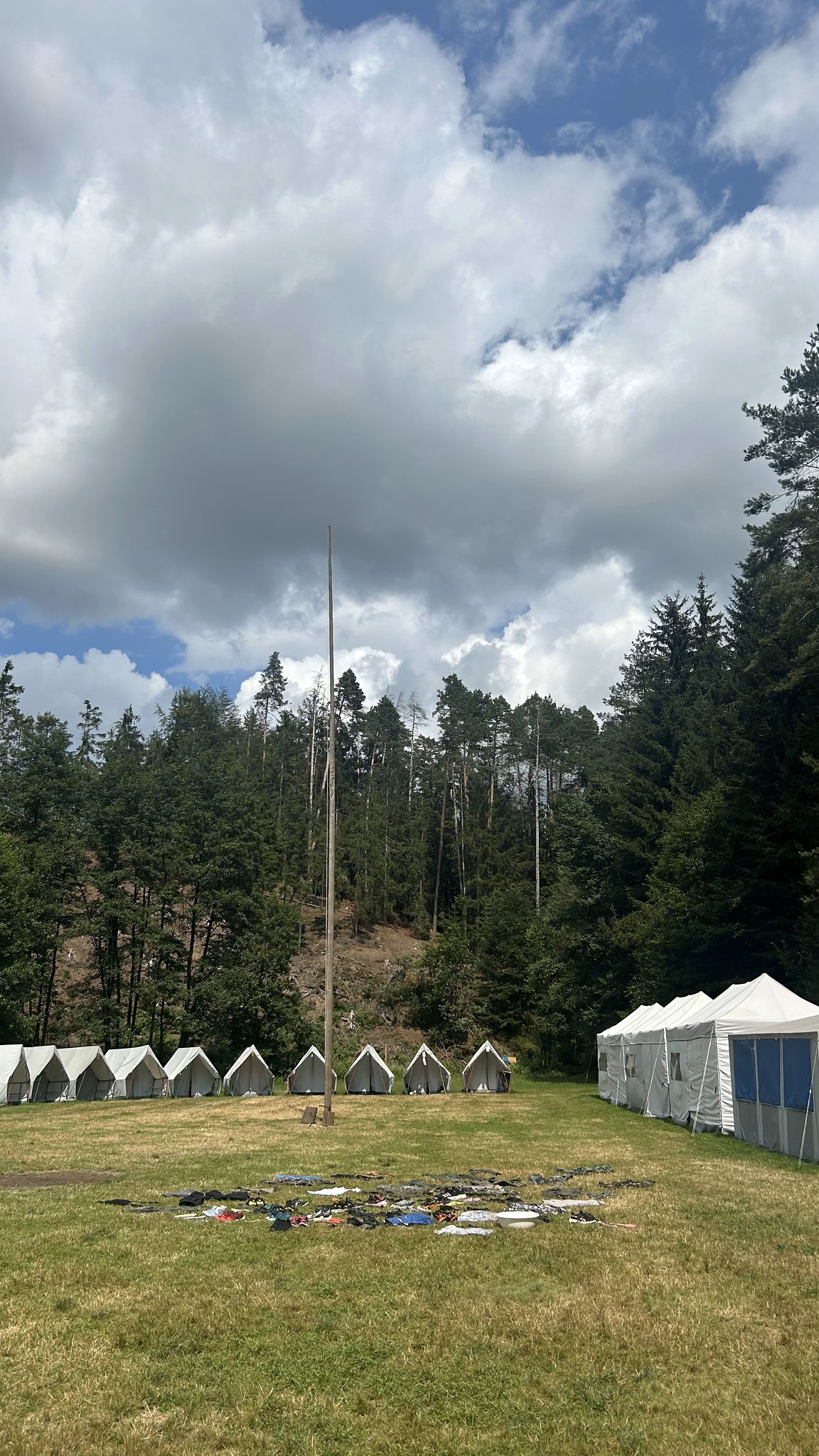 Nejdůležitější částí tábořiště (hned po kuchyni :-)) je prostor před stany. Tady míváme nástupy, při kterých vyvěšujeme vlajku. Hrajeme zde hry, máme zde nástupy na jídla, děti zde tráví polední klid a je to takový středobod všeho dění.